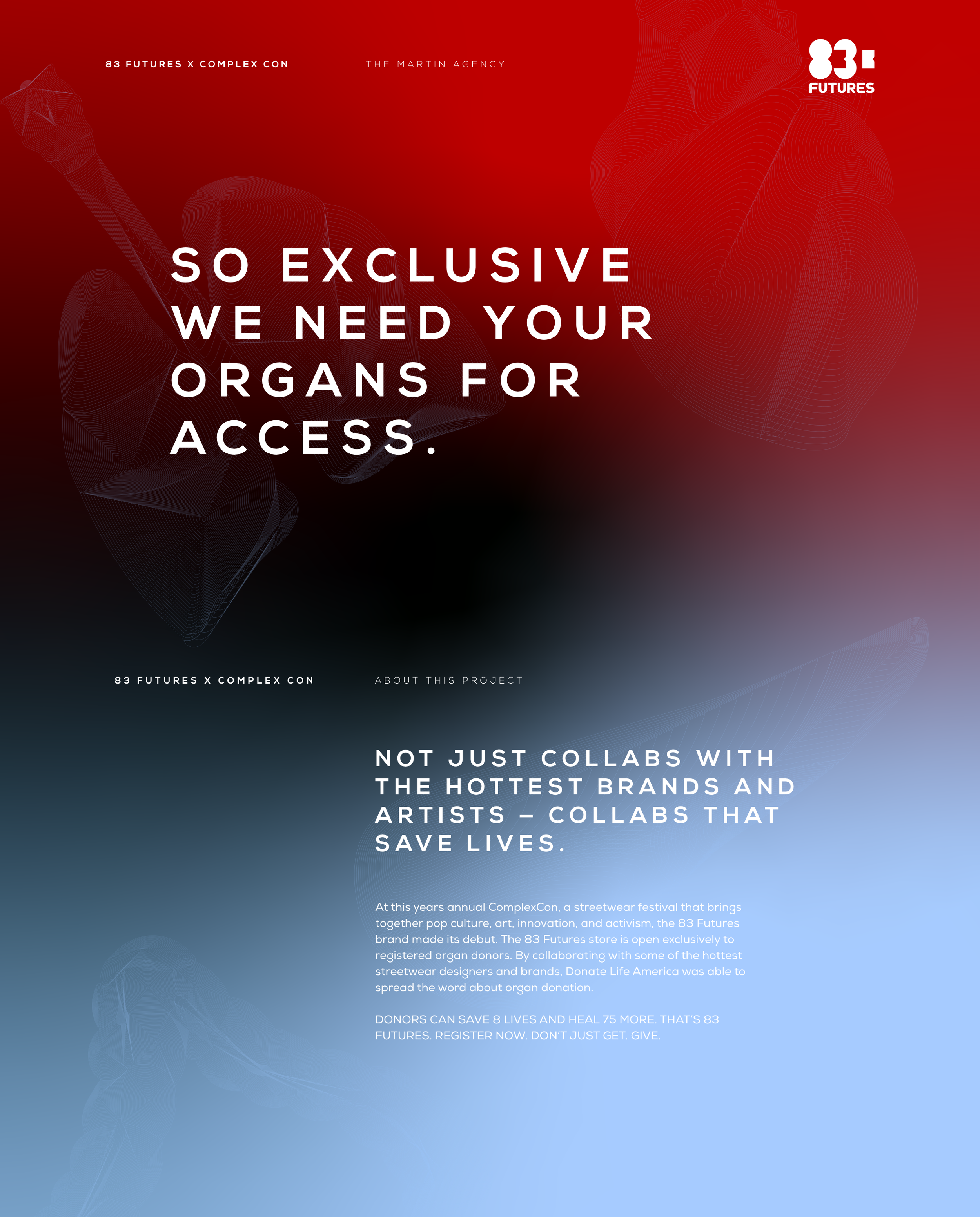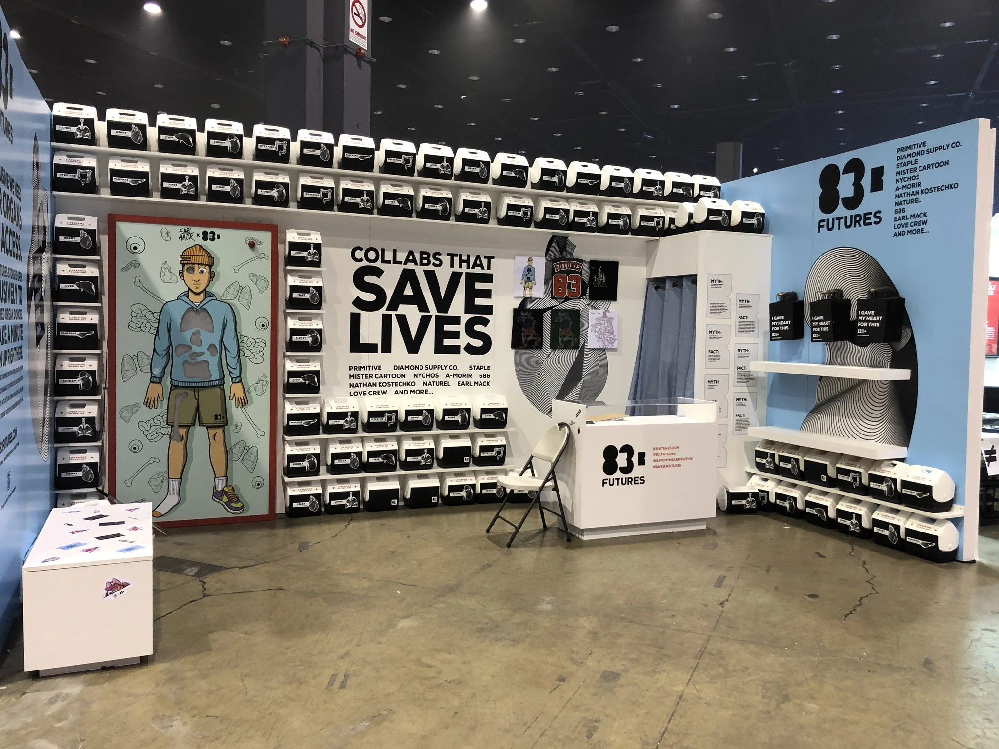 The 83 Futures Brand made its debut at ComplexCon, an annual Chicago based streetwear festival that brings together pop culture, art, innovation, and activism. The 83 Futures store is open exclusively to registered organ donors. By collaborating with some of the hottest streetwear designers and brands, Donate Life America was able to spread the word about organ donation.