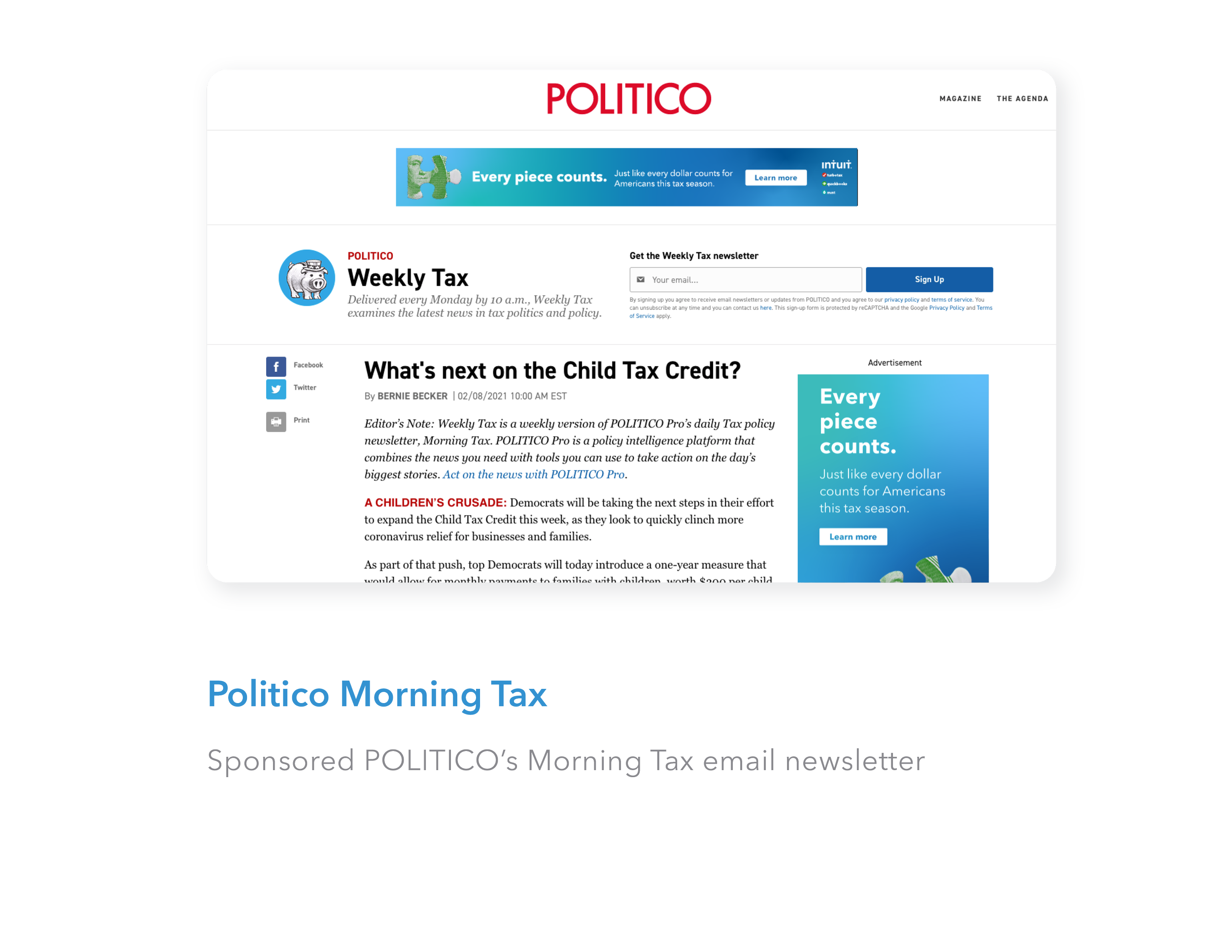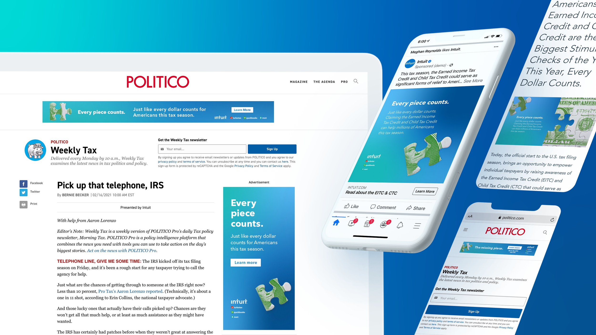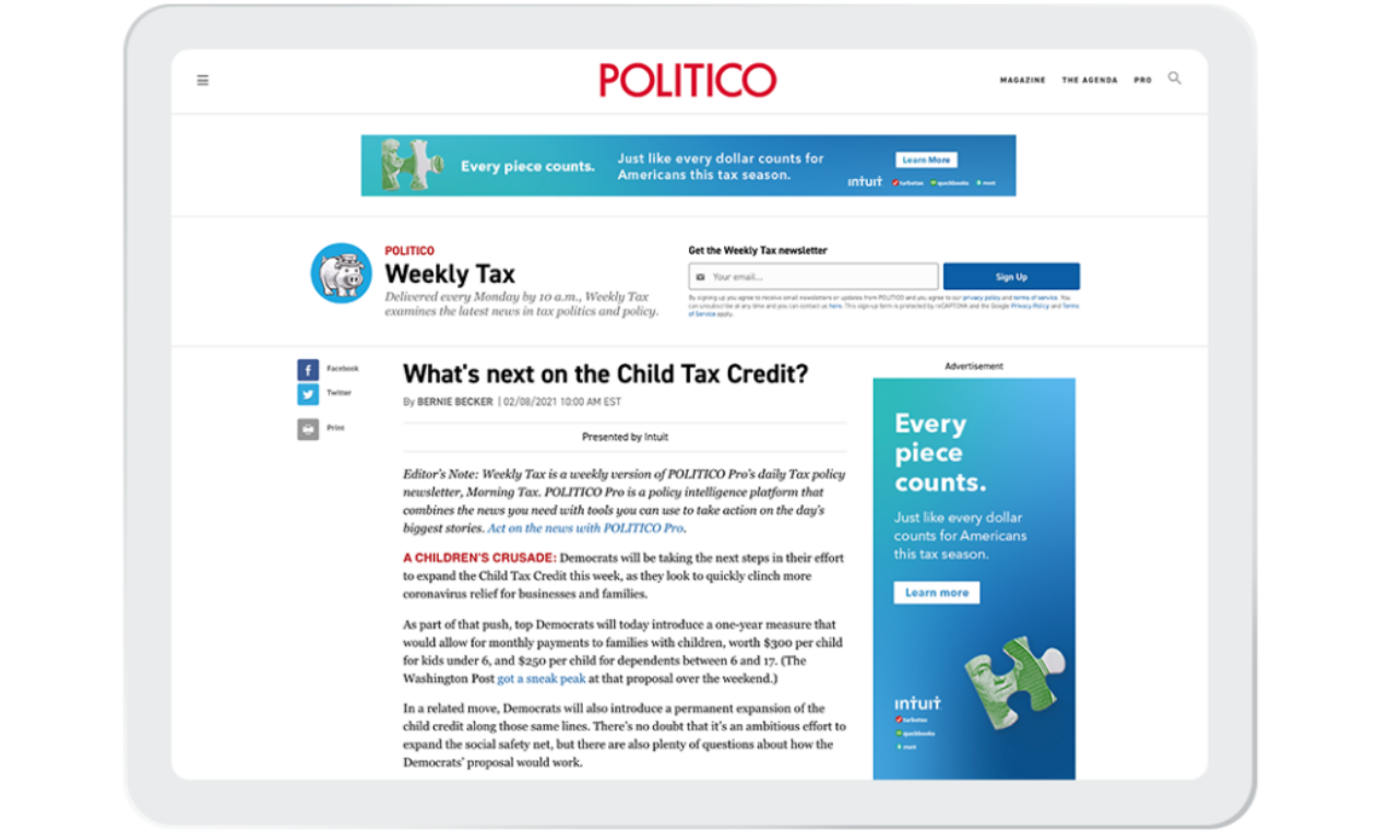 I worked alongside the Intuit team to help launch a digital ad campaign supporting the expansion of the EITC and the benefits it provides to millions of Americans. Targeted at policymakers, the campaign consisted of digital ads and banners that ran on Politico’s website, Intuit’s blog, and social channels such as LinkedIn, Twitter, and Facebook that are highly consumed by policymakers.