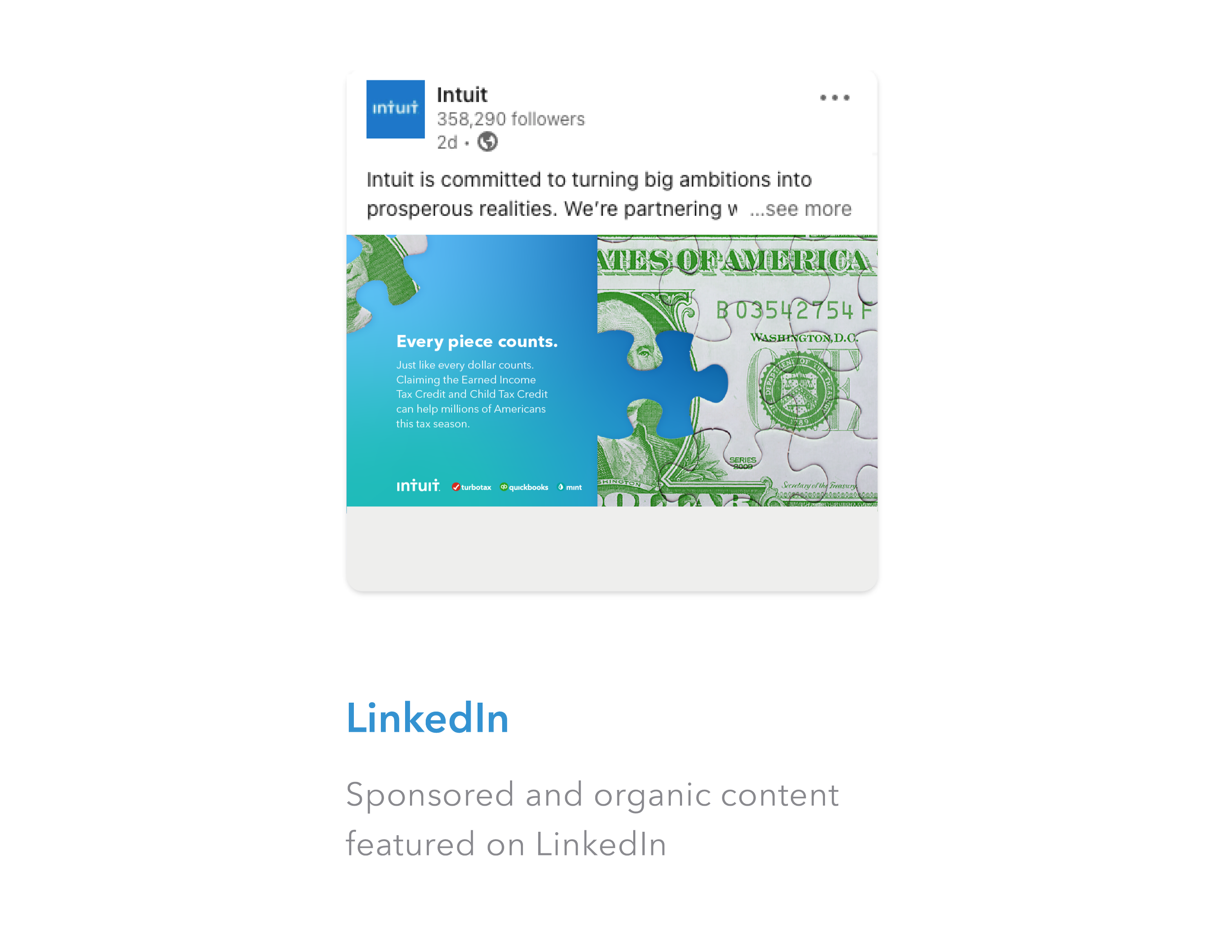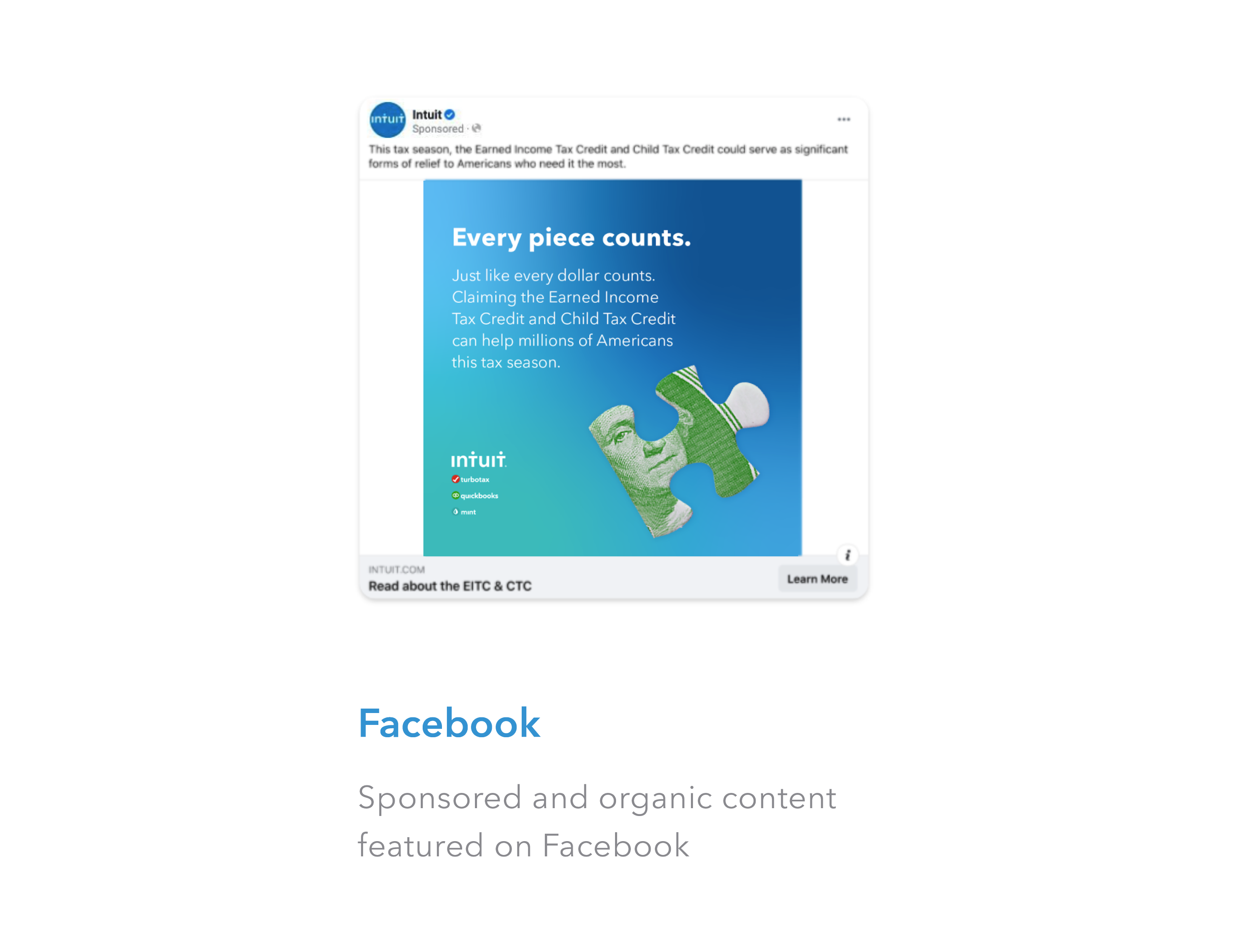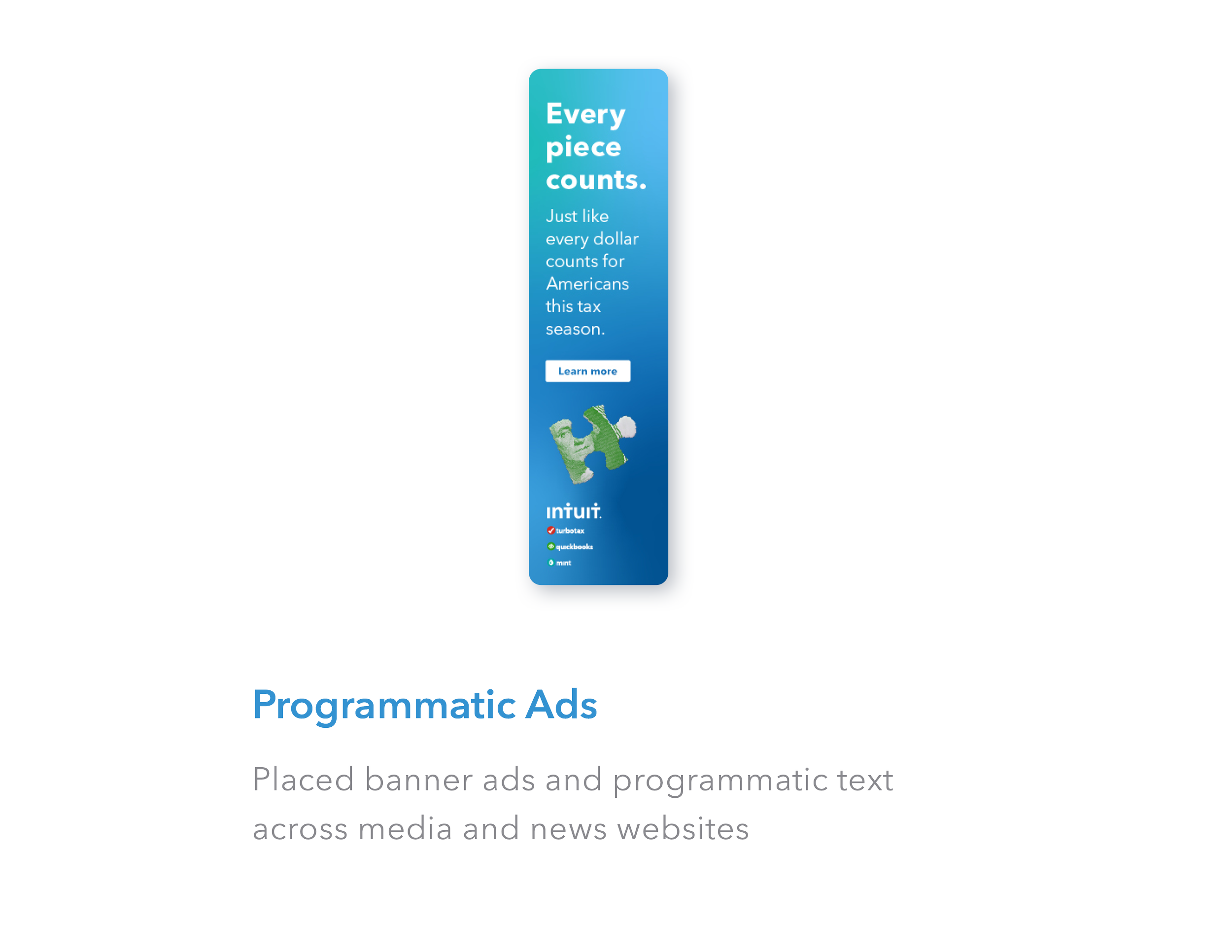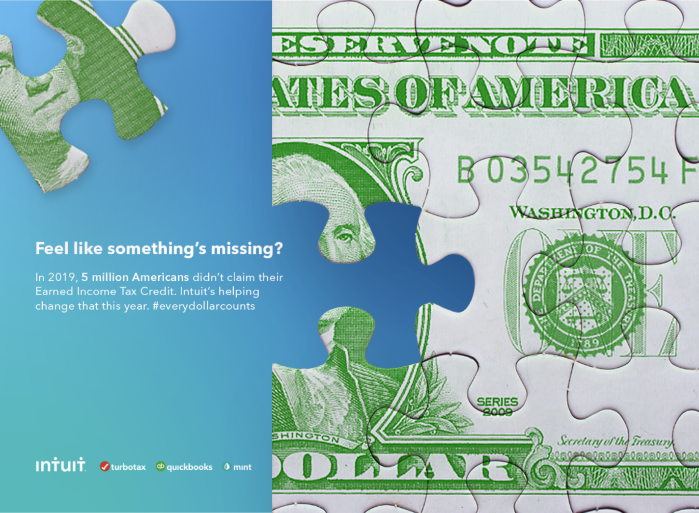 Four concepts were presented to the client in total with my concept “Missing Piece” being the chosen direction. I decided to feature two widely recognized symbols, a puzzle piece and a dollar bill, creating the appropriate metaphor to quickly capture policymaker’s attention and reinforce why Intuit supports the EITC.