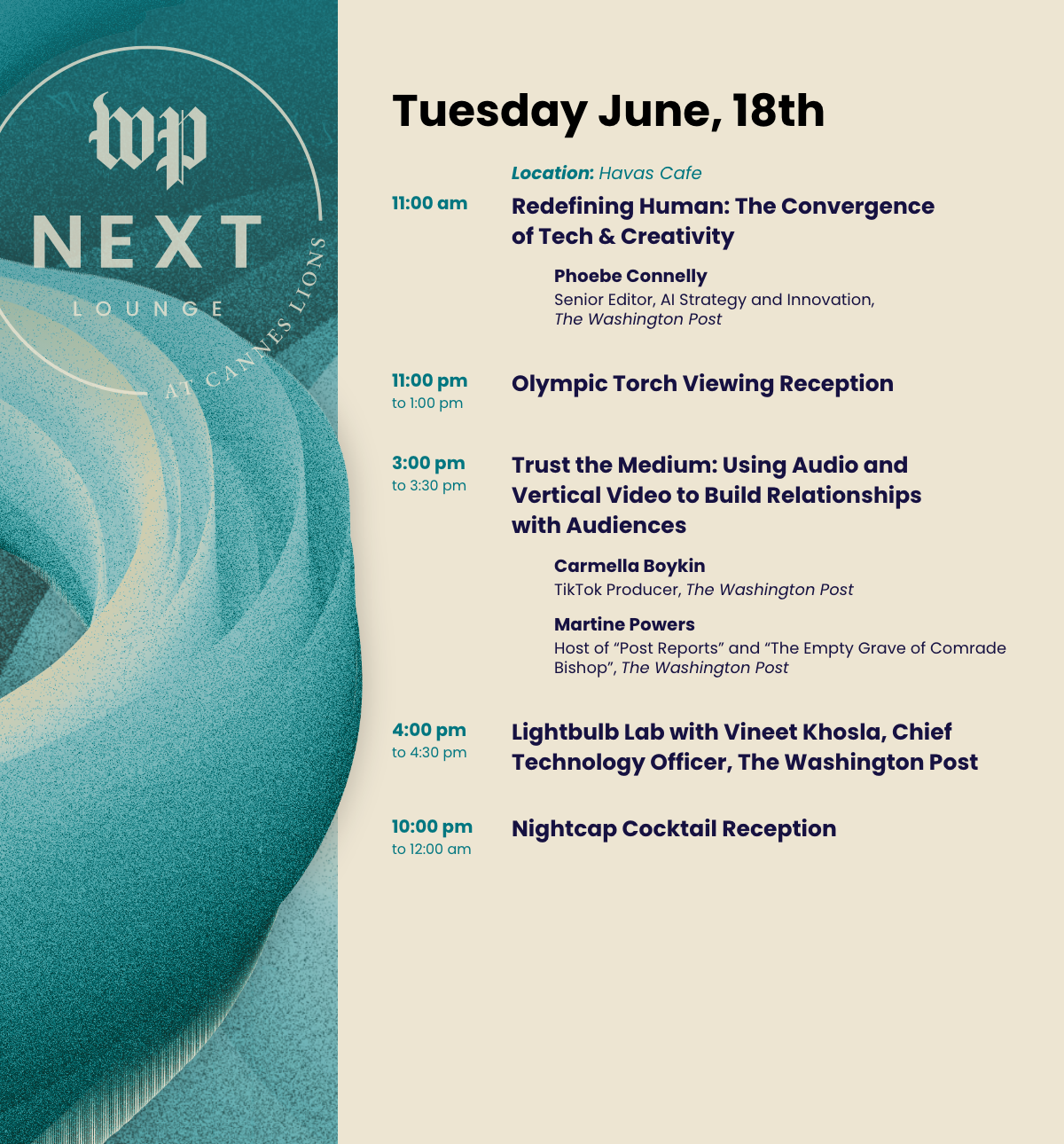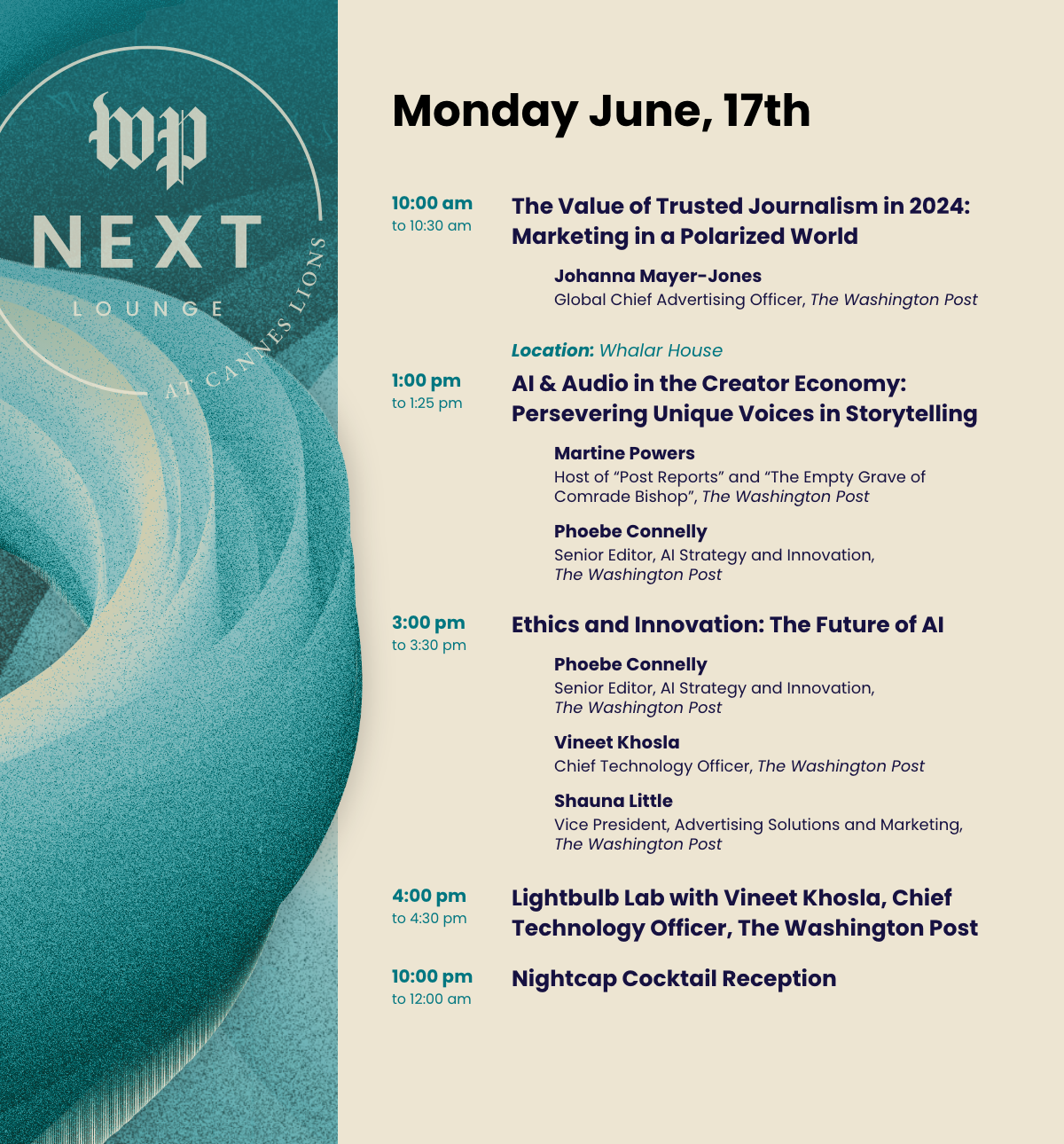 I helped design and create a full suite of graphics, including lower thirds, slate graphics, and logo animations, for The Washington Post Advertising’s annual gathering at Cannes Lions. This high-profile event showcases the future of digital advertising and marketing, bringing together industry leaders and award-winning journalists to discuss what’s next in the field. In addition to evolving the event’s visual identity, I also worked closely with stakeholders, ensuring seamless execution of assets across social and print channels.