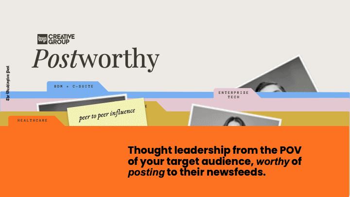 Postworthy is a social-first branded content product by The Washington Post Creative Group, designed to position brands as thought leaders through LinkedIn-driven campaigns. I helped establish its visual identity, drawing inspiration from vintage editorial design to create a distinctive, premium aesthetic that enhanced its marketability to clients.