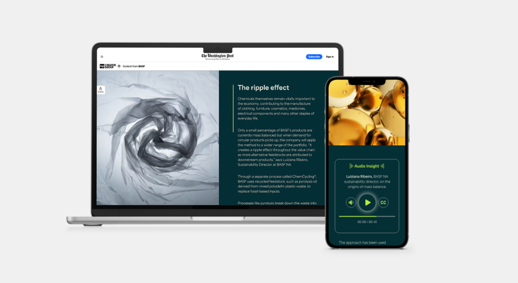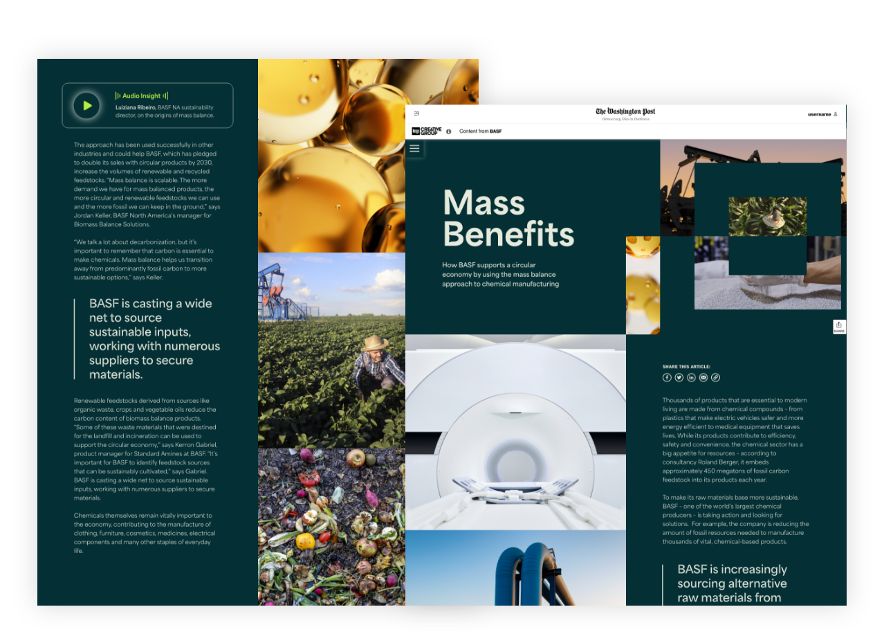 BASF, a global leader in chemical manufacturing, partnered with The Washington Post Creative Group to create a thought leadership piece that spotlights their commitment to a circular economy through a strategy called mass balance. The goal was to position BASF as a regional sustainability expert and drive quality engagement to the broader campaign site.